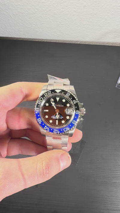 Inspired by the iconic Submariner GMT design and equipped with the prestigious Seiko NH34 automatic movement , we introduce the Seiko Mod GMT . A 40mm timepiece, hand-assembled with precision, that combines luxury, functionality and accessibility in a timeless design.