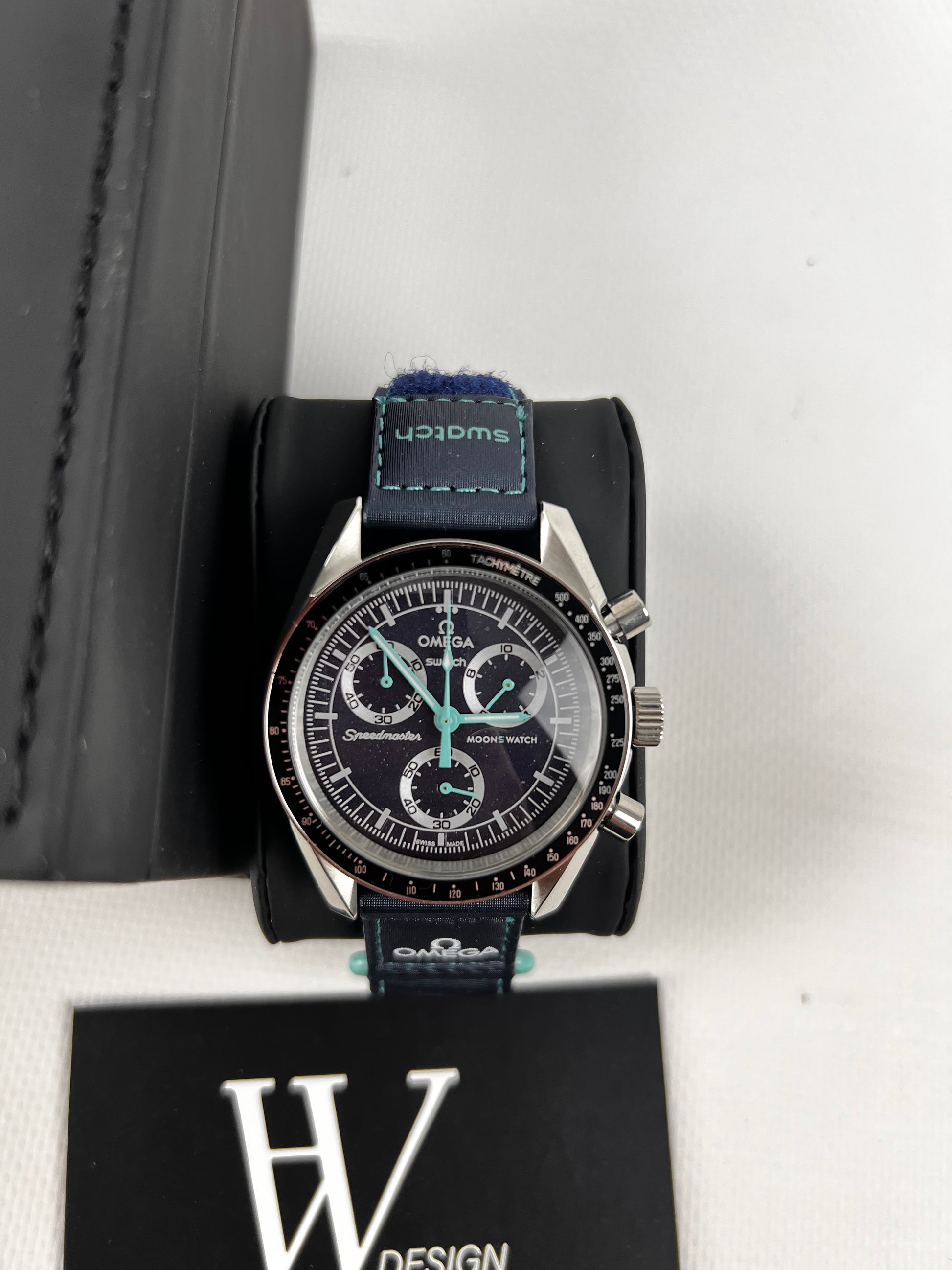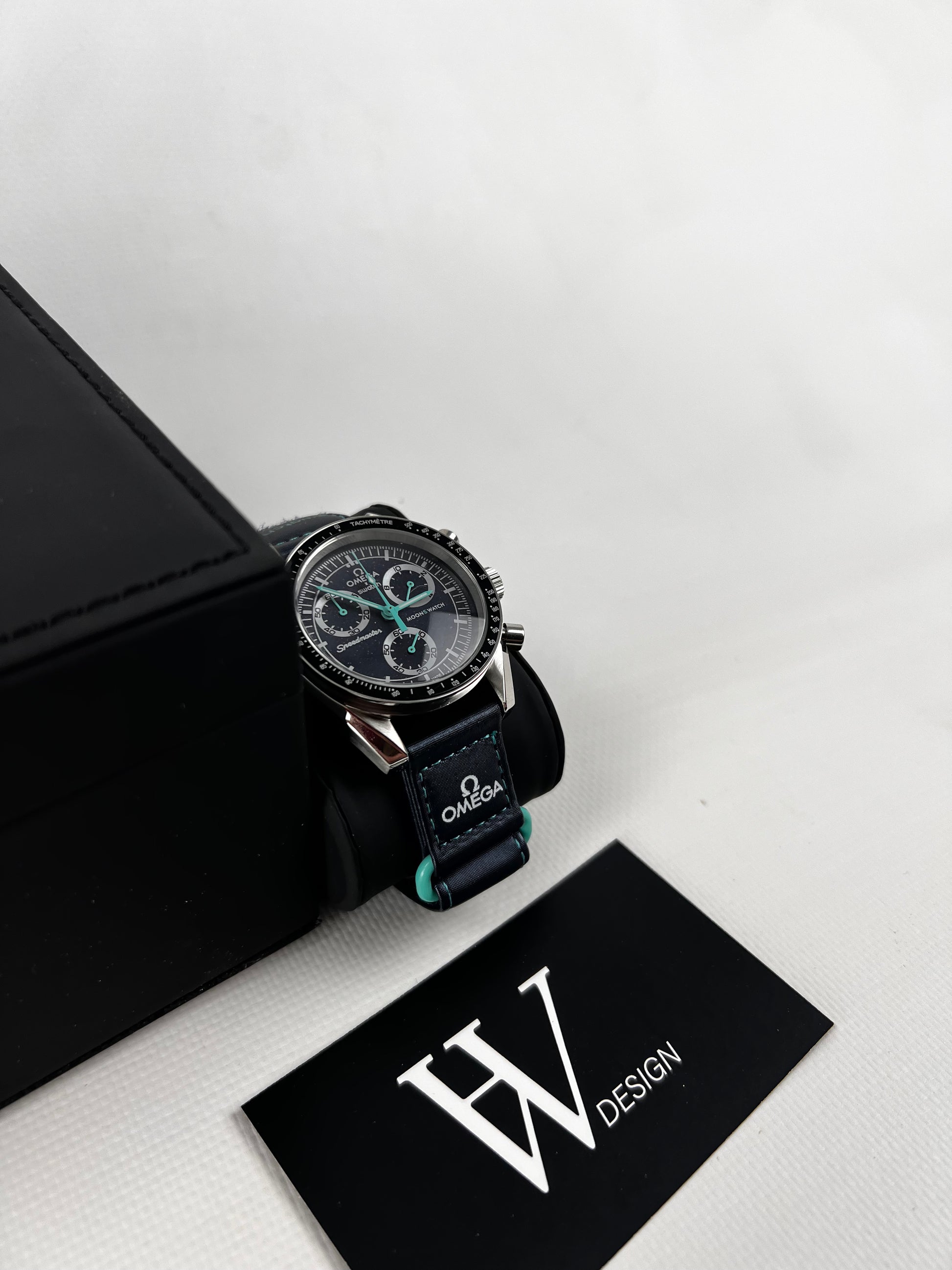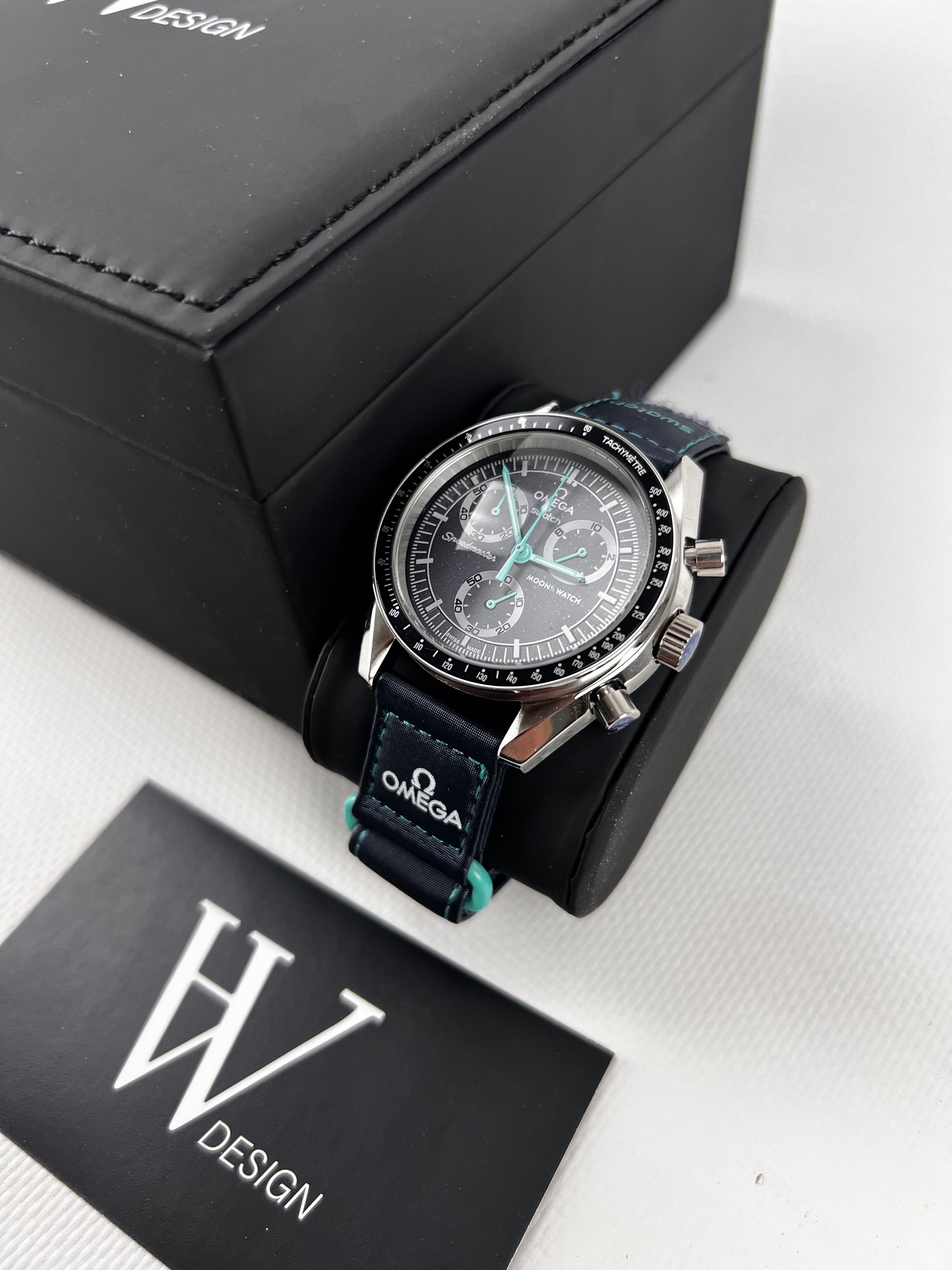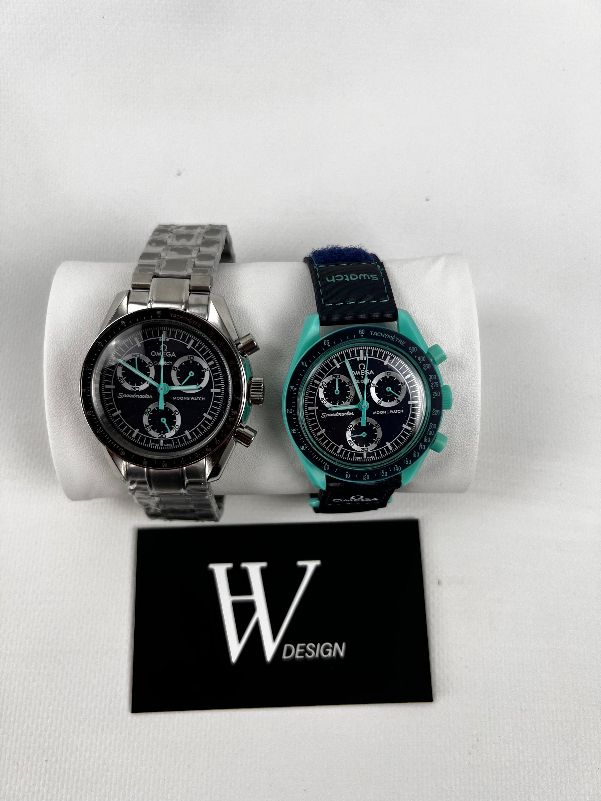 Basado en el Omega x Swatch Mission to Earth Polar lights, en HW presentamos su mejor versión, reemplazando la caja original de plástico por una caja y correa en acero inoxidable 316l y cristal de Zafiro.